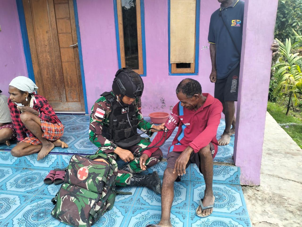 Maybrat – Satgas Pamtas Kewilayahan Yonif 623/BWU, Pos Kokas memberikan pengobatan kepada warga Kampung Kokas, Distrik Aifat, Kabupaten Maybrat, Papua Barat Daya,